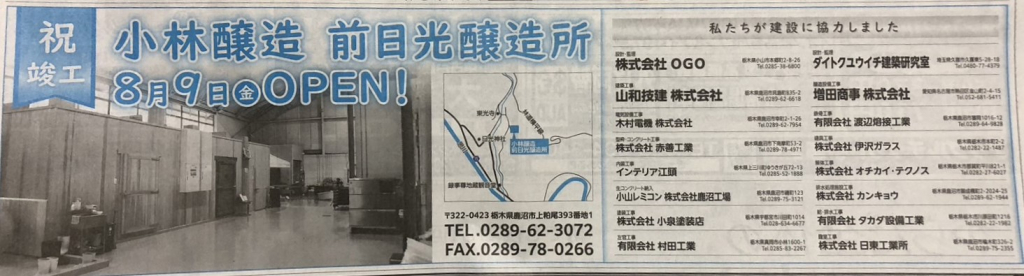 小林醸造様 前日光醸造所の建設に協力させて頂きました🌲